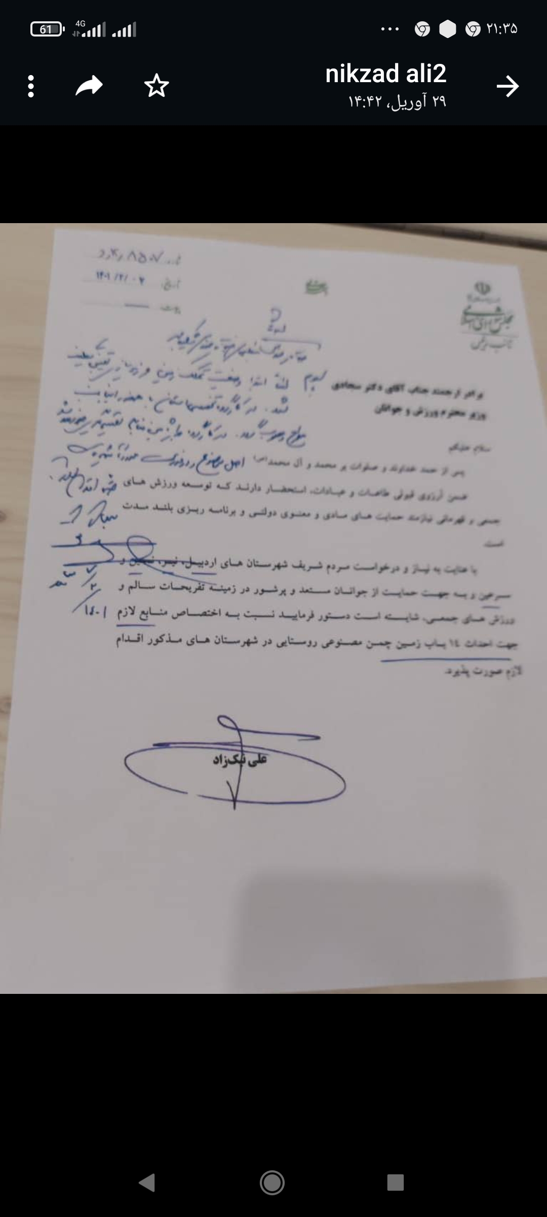 در این جلسه علی نیکزاد دستور لازم برای اختصاص منابع لازم جهت احداث ۱۴ باب زمین چمن مصنوعی روستایی در حوزه انتخابیه را اخذ کرد.