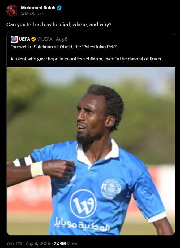 محمد صلاح به پیام تسلیت اتحادیه فوتبال اروپا (یوفا) درباره شهادت سلیمان العبید، فوتبالیست 41 ساله فلسطینی ملقب به «پله فلسطینی»، واکنش نشان داد و خواستار توضیح درباره جزئیات مرگ او شد.